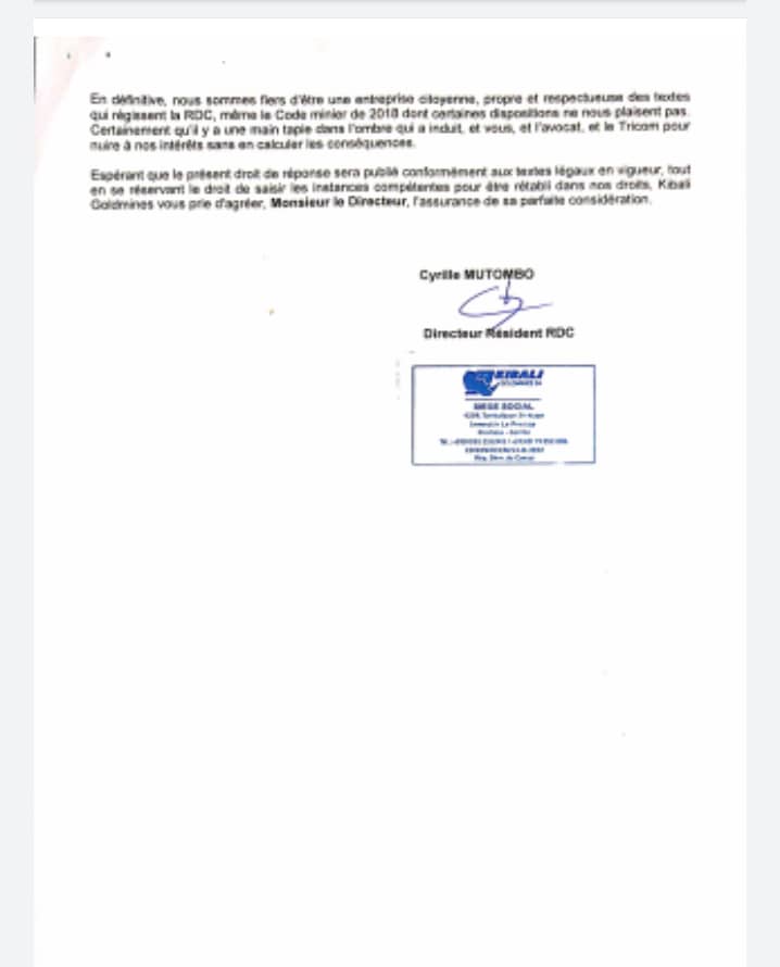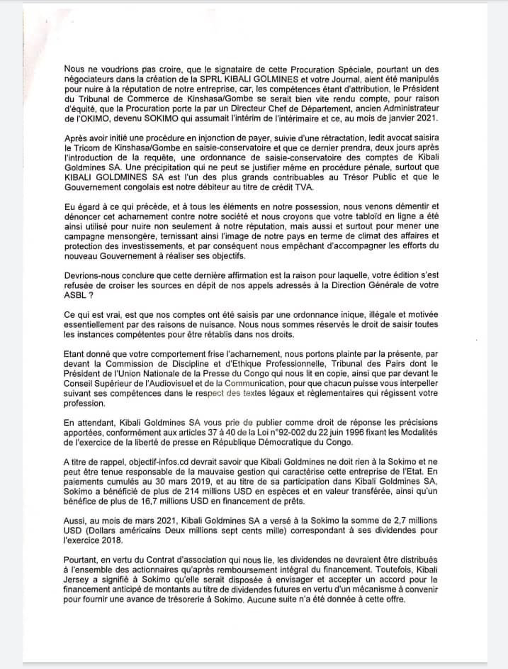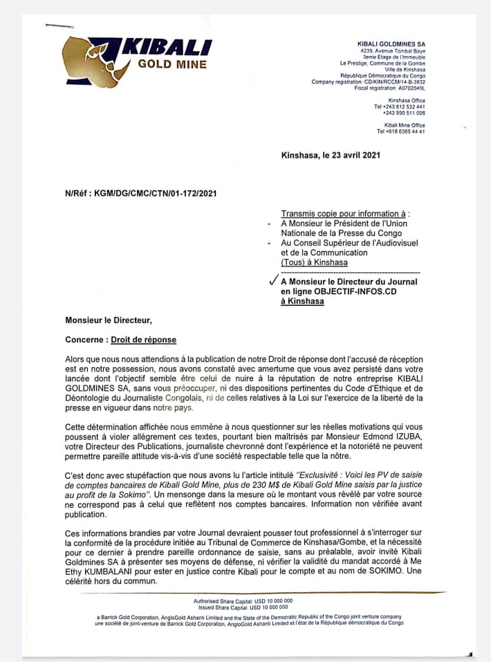 Saisie de comptes de Kibali Goldmines : Voici le droit de réponse de Kibali Goldmines à la rédaction Objectif-Infos.cd 0 Par La Rédaction sur 30/04/2021 Société Par la Rédaction Ci-dessous, le droit de réponse de la société Kibali Goldmines envoyé à la rédaction d’Objectif-infos.